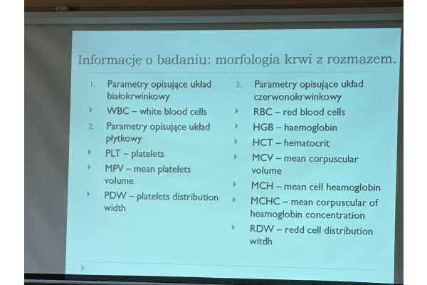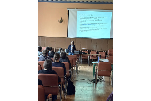 W wydarzeniu wzięli udział uczniowie klas II i III o profilu medycznym, którzy mieli okazję poszerzyć swoją wiedzę z zakresu hematologii oraz zobaczyć, jak teoria przekłada się na praktykę diagnostyczną. Pani Doktor w przystępny sposób omówiła różnorodne zmiany zachodzące w komórkach krwi w przebiegu chorób, ilustrując je przykładami oraz materiałami poglądowymi.
