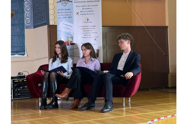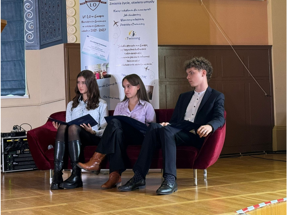 W wydarzeniu uczestniczyły klasy pierwsze i drugie, a spotkanie poprowadzili z wielką kulturą i zaangażowaniem: Lena Manerowska, Patrycja Budzeń i Leonard Bukowiecki.