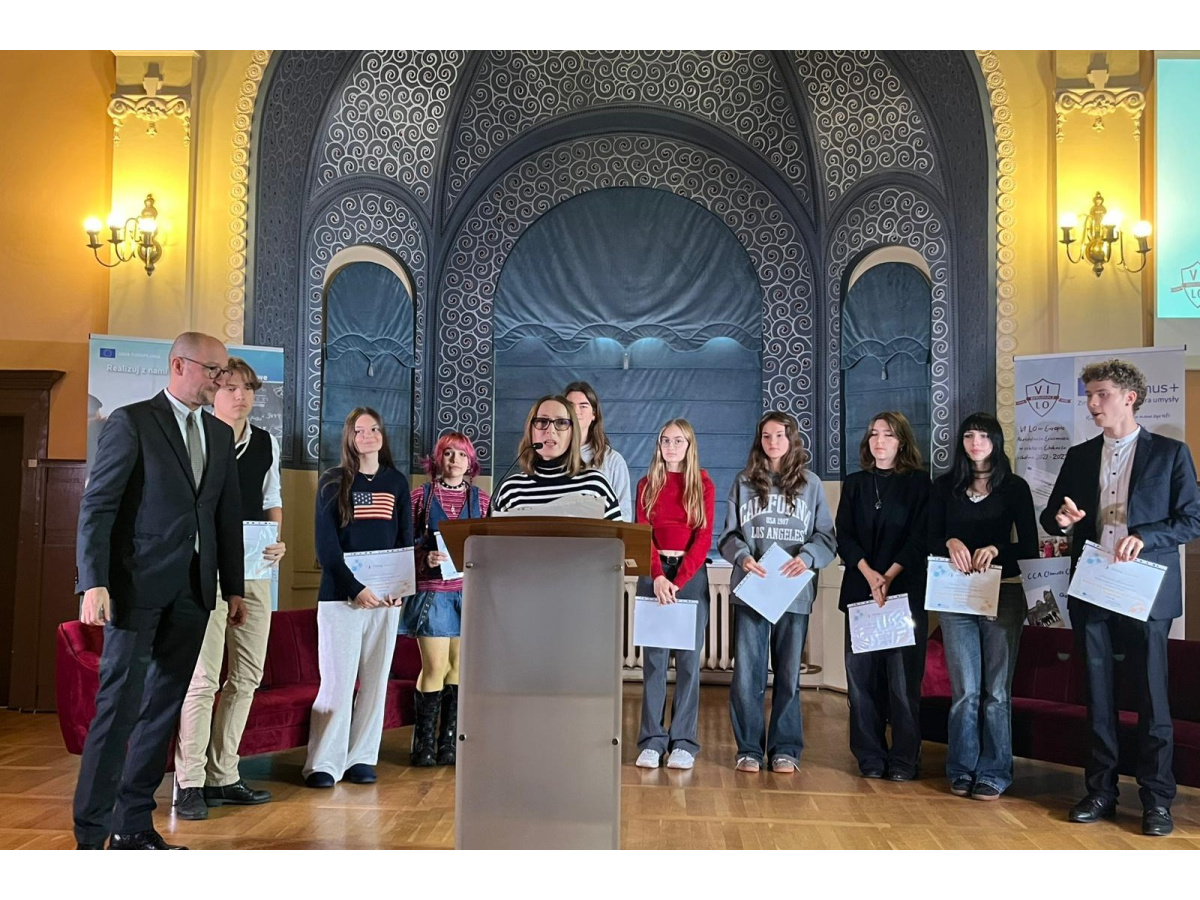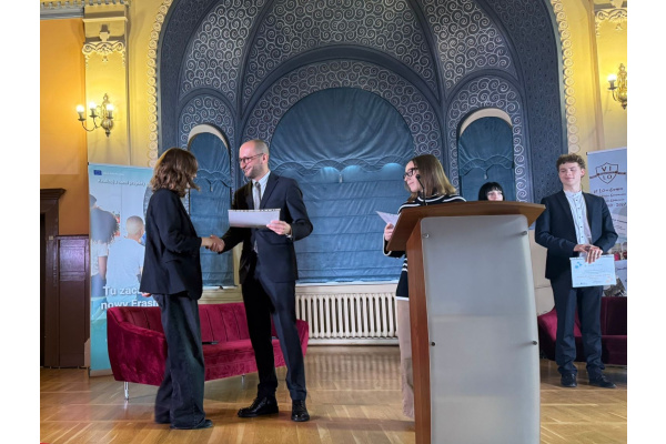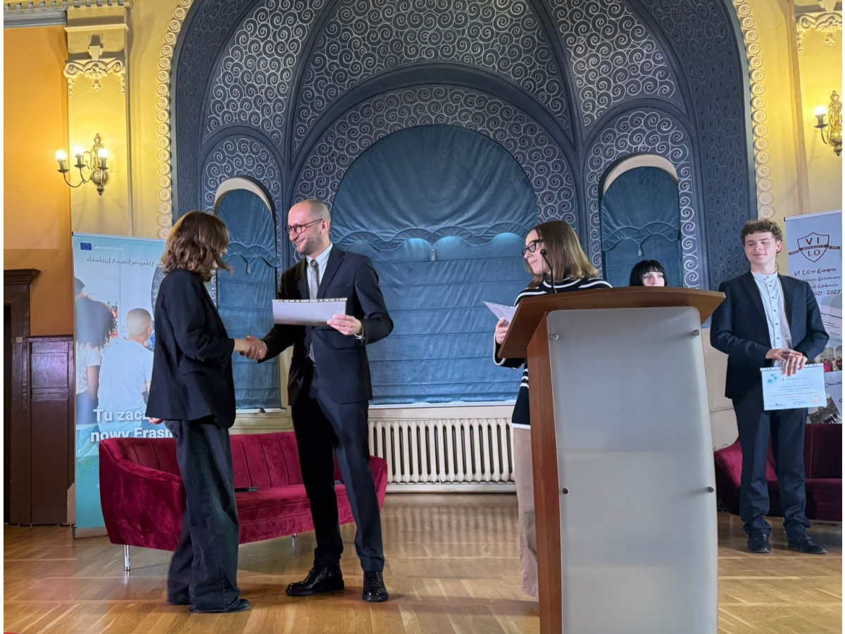 Na zakończenie spotkania odbyło się wręczenie dyplomów uczestnikom nagrodzonych Krajową Odznaką Jakości projektów eTwinning: Symphonie of European Cultures i Beyond the Pages: English Literary Treasures. Dyplomy wręczyli wspólnie dr Sławomir Drelich oraz pani Joanna Lisewska, szkolna koordynatorka programów Erasmus+ i eTwinning.