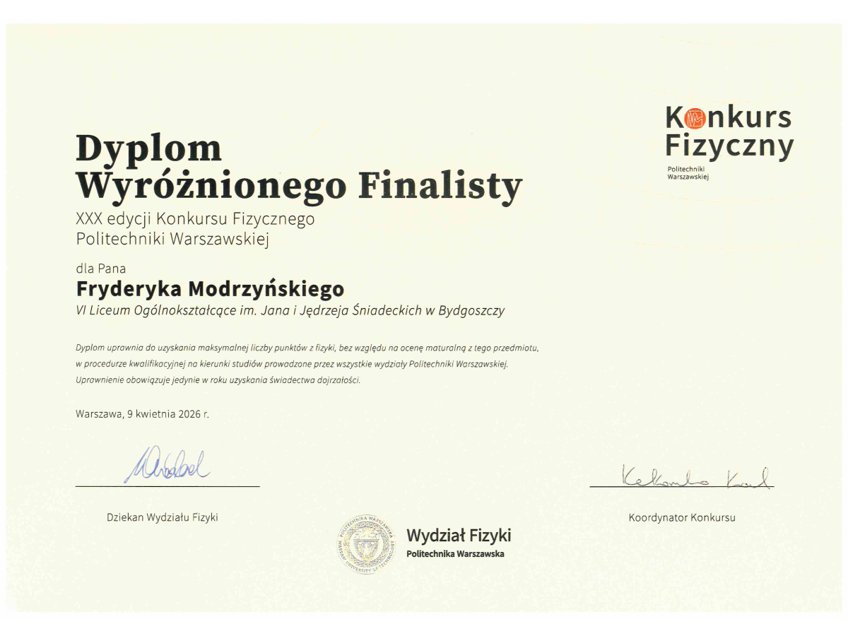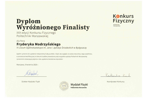 Fryderyk Modrzyński (klasa 3a) uzyskał tytuł Wyróżnionego Finalisty XXX edycji Konkursu Fizycznego Politechniki Warszawskiej. Konkurs ten jest organizowany przez Wydział Fizyki Politechniki Warszawskiej i należy do najbardziej prestiżowych wydarzeń tego typu w kraju.