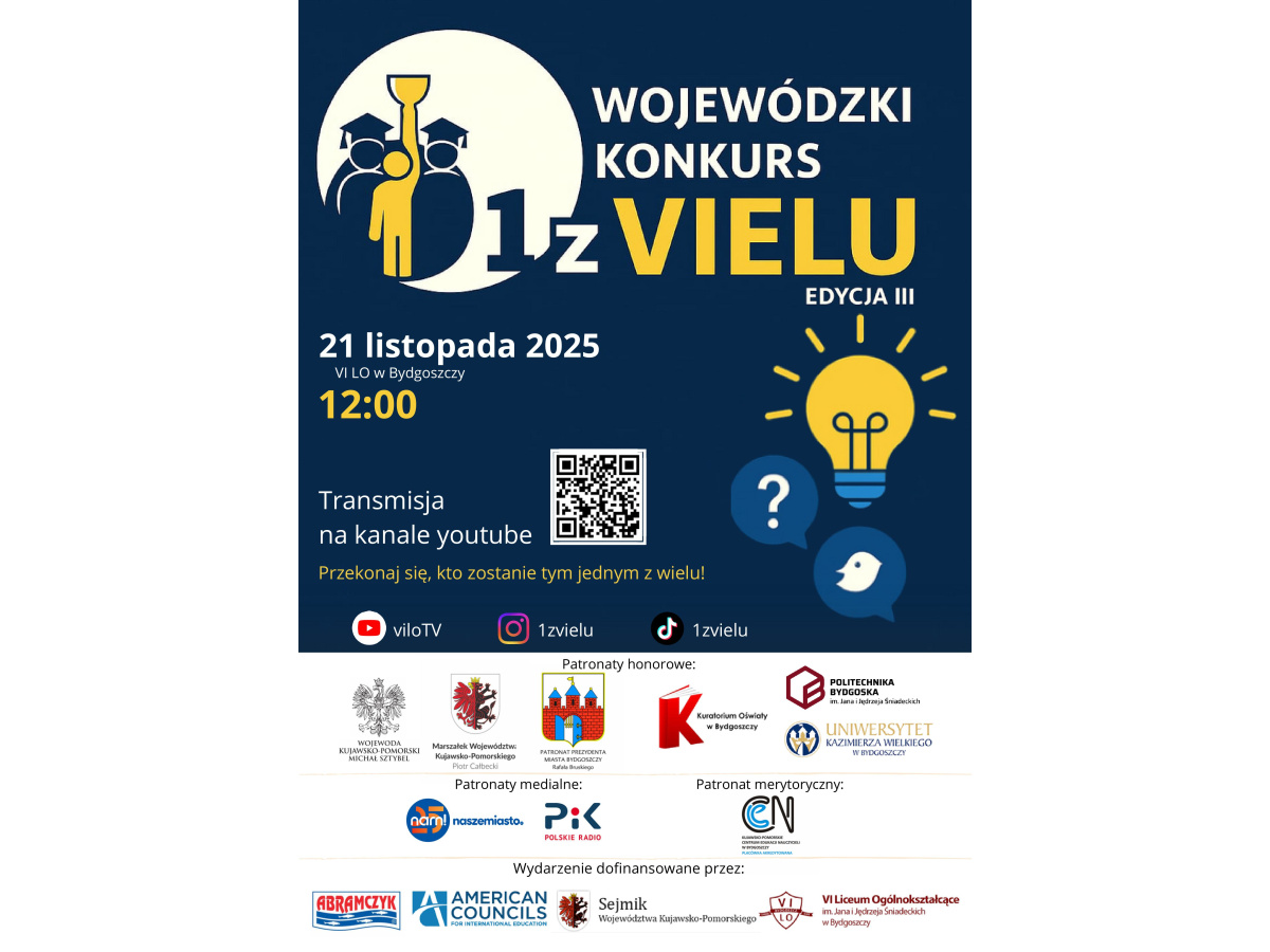"1 z VIELU" to konkurs wiedzy ogólnej skierowany do uczniów szkół średnich w województwie kujawsko-pomorskim wzorowany na brytyjskim teleturnieju "Fifteen to One". W tym roku w naszej Szkole ma miejsce kolejna odsłona Konkursu, organizowana przez Michała Barańskiego, ucznia klasy 3F oraz Magdalenę Grzechowiak, absolwentkę naszej Szkoły przy wsparciu pani mgr Katarzyny Sobczak.