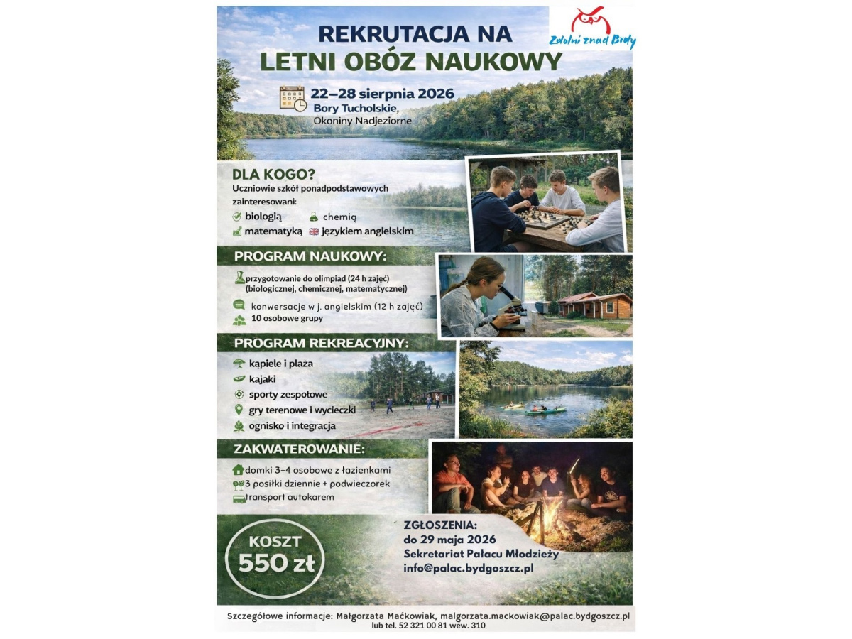 Szczegółowe informacje: https://edu.bydgoszcz.pl/zdolniznadbrdy/rekrutacja-uczniow-na-letni-oboz-naukowy-2026-w100,1310,112213.html